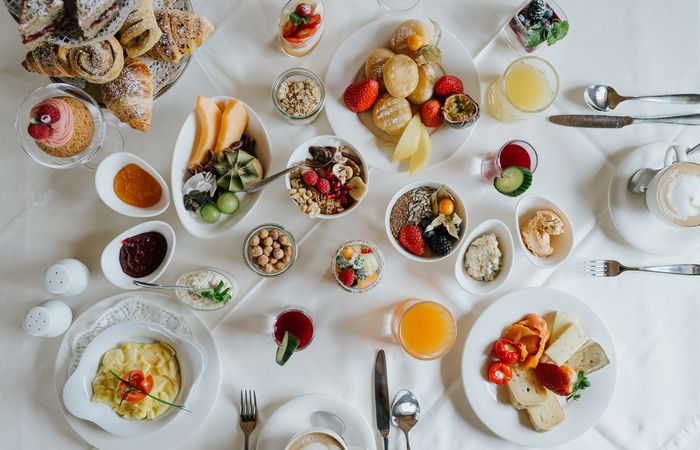 Ein Fest für alle Sinne: Frische Südtiroler Bio-Produkte von lokalen Produzenten, hausgemachte Kuchen und individuell zubereitete Eierspeisen.